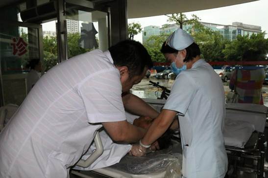 中午1点左右风雨稍微减弱后,急诊科在半小时内涌入大量外伤患者,同时遇到全城停电,整个急诊科人声鼎沸。在刘志龙院长的现场指挥下,李军同志立即安排科室人员进行分诊抢救的同时,马上联系全院外科医生及护理、后勤人员紧急支援抢救,瞬时间整个急诊科成了“战场”,无论是急诊手术室、抢救室甚至留观室都同时开展清创缝合手术,在院领导及李军同志的现场指挥协调下,整个急救工作在紧张忙碌而井然有序中展开,全院医护人员不顾个人安危、坚守岗位、团结一心、众志成城,成功度过了台风期间救治患者的高峰期。